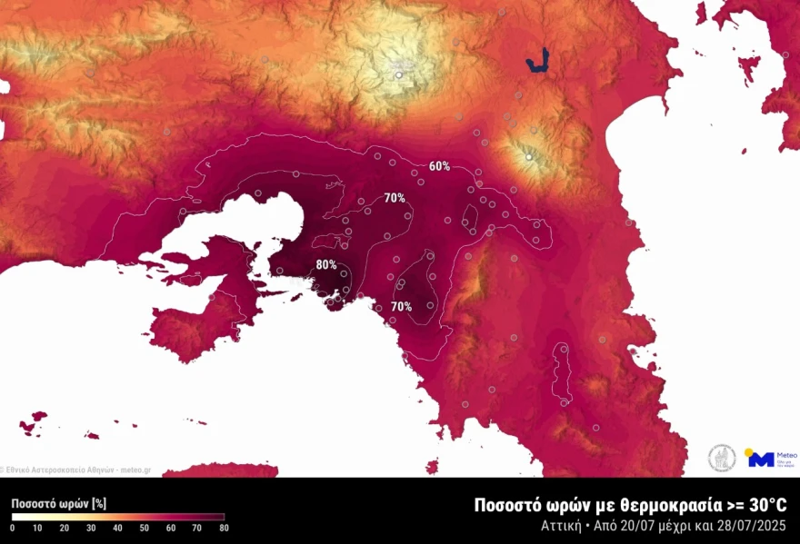 Το μεγάλο αποτύπωμα του καύσωνα εμφανίζεται για άλλη μια φορά στα αστικά κέντρα. Όπως παρουσιάζεται και στον χάρτη της Εικόνας 2, σε περιοχές στην Αττική καταγράφηκαν ποσοστά όπου ακόμα και το 80% των συνολικών ωρών της περιόδου 9 ημερών (20-28/07/2025) η θερμοκρασία ήταν ίση ή πάνω από 30°C, πράγμα που σημαίνει πως ακόμη και κατά τη διάρκεια της νύχτας η θερμοκρασία δεν κατάφερνε να υποχωρήσει σε πολλές περιπτώσεις ακόμη και κάτω από τους 30°C.