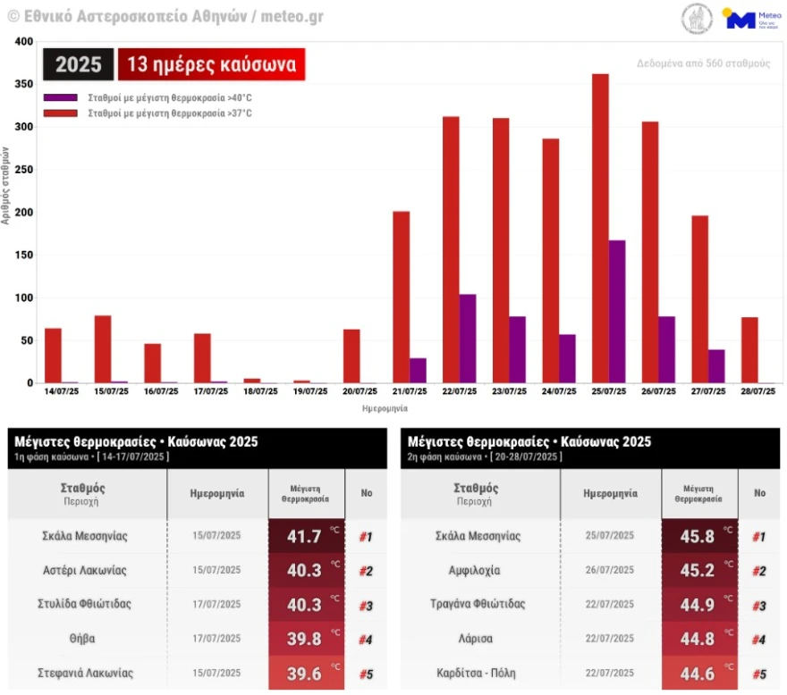 Στο διάγραμμα που ακολουθεί, σύμφωνα με τις καταγραφές του δικτύου αυτόματων μετεωρολογικών σταθμών του Εθνικού Αστεροσκοπείου Αθηνών/ Meteo.gr, παρουσιάζεται ο αριθμός των σταθμών όπου η θερμοκρασία ξεπέρασε τους 37°C και τους 40°C (κόκκινες και μωβ μπάρες, αντίστοιχα).