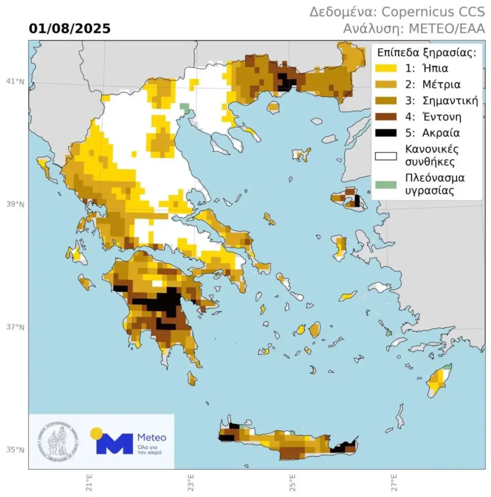 Ανάλυση του meteo του Εθνικού Αστεροσκοπείου Αθηνών, καταγράφει τον δείκτη ξηρασίας στην Ελλάδα την 1η Αυγούστου 2025.