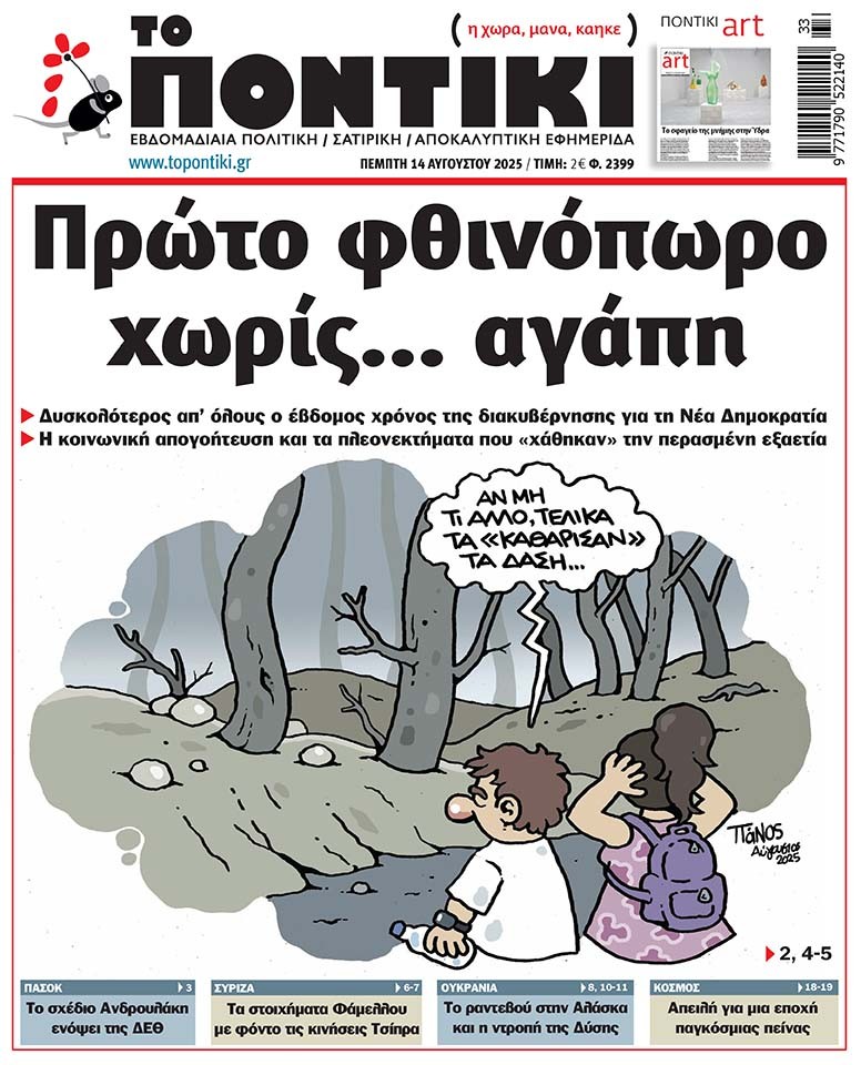 Με πρωτοσέλιδο τίτλο «Πρώτο Φθινόπωρο χωρίς… αγάπη» και αναλυτικό – αποκαλυπτικό ρεπορτάζ για τον δυσκολότερο από όλους έβδομο χρόνο της διακυβέρνησης της Νέας Δημοκρατίας και την κοινωνική απογοήτευση και τα πλεονεκτήματα που «χάθηκαν» την περασμένη εξαετία, κυκλοφορεί το «ΠΟΝΤΙΚΙ» το πρωί της Πέμπτης.