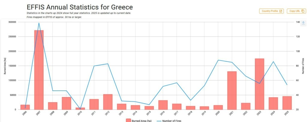 Ήδη το 2025, με 454.000 καμένα στρέμματα μέχρι τις 19/08, κατατάσσεται στην 5η χειρότερη θέση των τελευταίων 20 ετών όσον αφορά στις καμένες εκτάσεις.