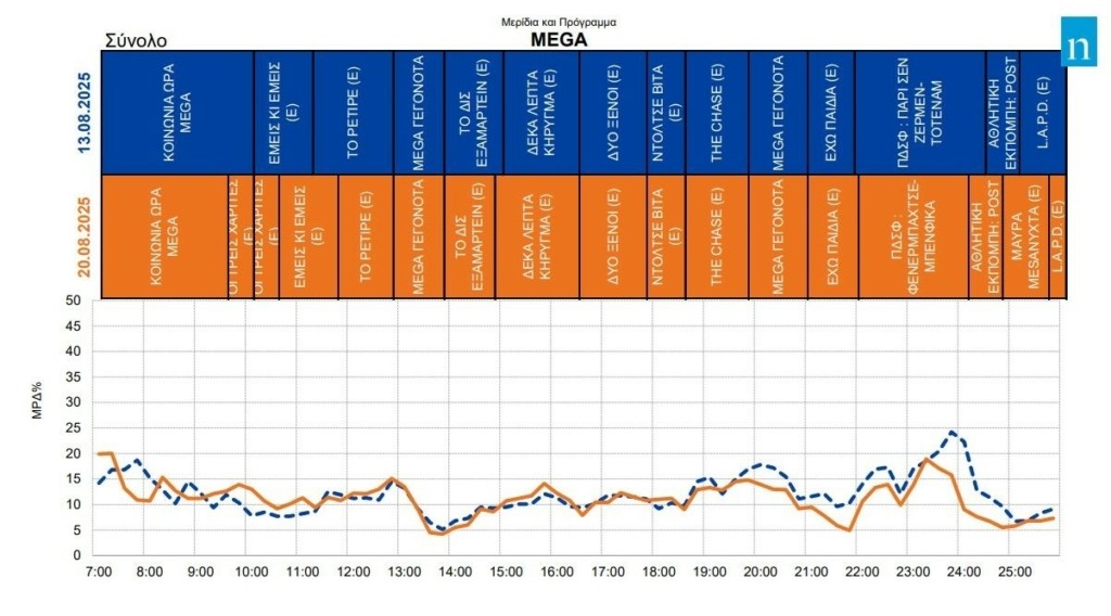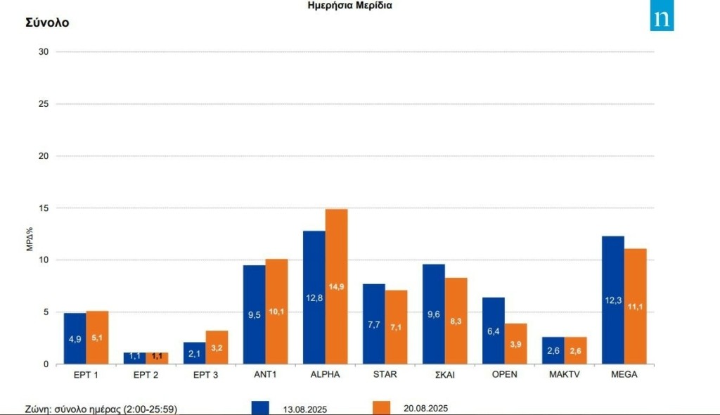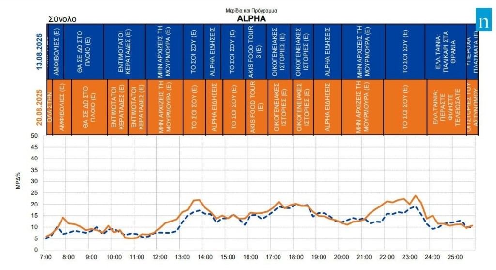O δείκτης της Nielsen στάθηκε στο 14,9%, χθες, στον Alpha κατά την δυναμομέτρηση των καναλιών μακράν η υψηλότερη του ανταγωνισμού, όχι μόνον σε επίπεδο ημέρας, αλλά και σε σχεδόν ένα μήνα (Alpha 15,2% στις 28/7).