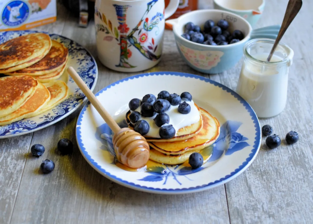 Αφράτες τηγανίτες σερβιρισμένες με κρέμα γιαουρτιού – μελιού και φρέσκα μύρτιλα, ιδανικές για το πρωινό του Σαββατοκύριακου ή για τις τελευταίες ημέρες της καλοκαιρινής άδειας που είναι πιο χαλαρές.