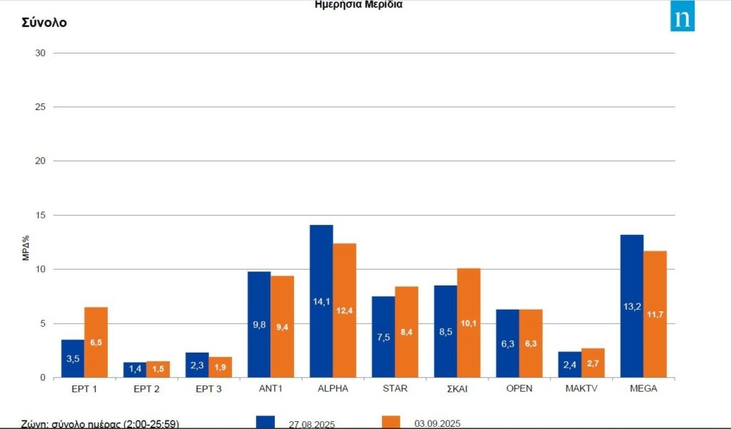 Τα πρωτεία στις τηλεπροτιμήσεις διατήρησε ο Alpha, τάση ανόδου εμφάνισε το Mega, μια θέση πιο πίσω διατηρήθηκε ο ΣΚΑΪ, αλλά χάνοντας μισή ποσοστιαία μονάδα και ο ΑΝΤ1 παρέμεινε τέταρτος αλλά με βελτίωση κατά 0,2 του μεριδίου του. Πιο κοντά στο 3% βρέθηκε χθες το MAK TV.
