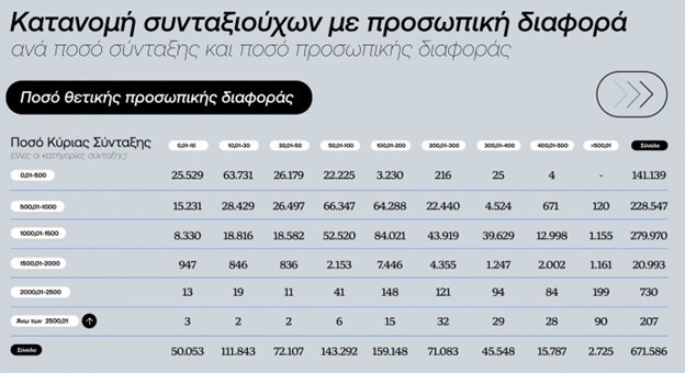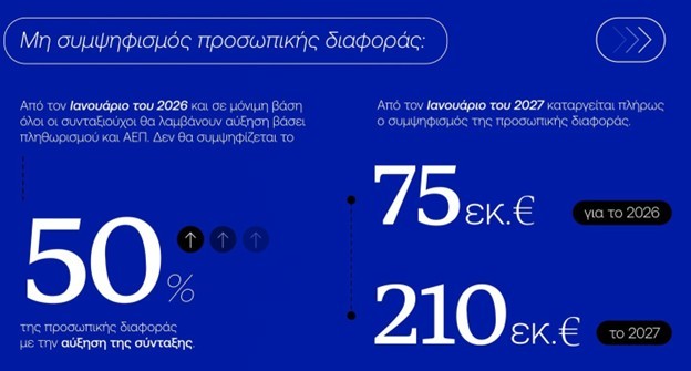 Ιδιαίτερα σημαντική είναι η αλλαγή στον τρόπο που θα αντιμετωπίζεται η λεγόμενη «προσωπική διαφορά». Μέχρι σήμερα, μεγάλο μέρος των αυξήσεων συμψηφιζόταν με την προσωπική διαφορά, με αποτέλεσμα πολλοί συνταξιούχοι να μη βλέπουν πραγματική βελτίωση στο εισόδημά τους. Από το 2026 και μετά, μόνο το 50% της αύξησης θα συμψηφίζεται με την προσωπική διαφορά, ενώ από το 2027 ο συμψηφισμός καταργείται εντελώς. Έτσι, οι αυξήσεις θα περνούν ακέραιες στη σύνταξη, κάτι που αφορά περίπου 671.000 συνταξιούχους.