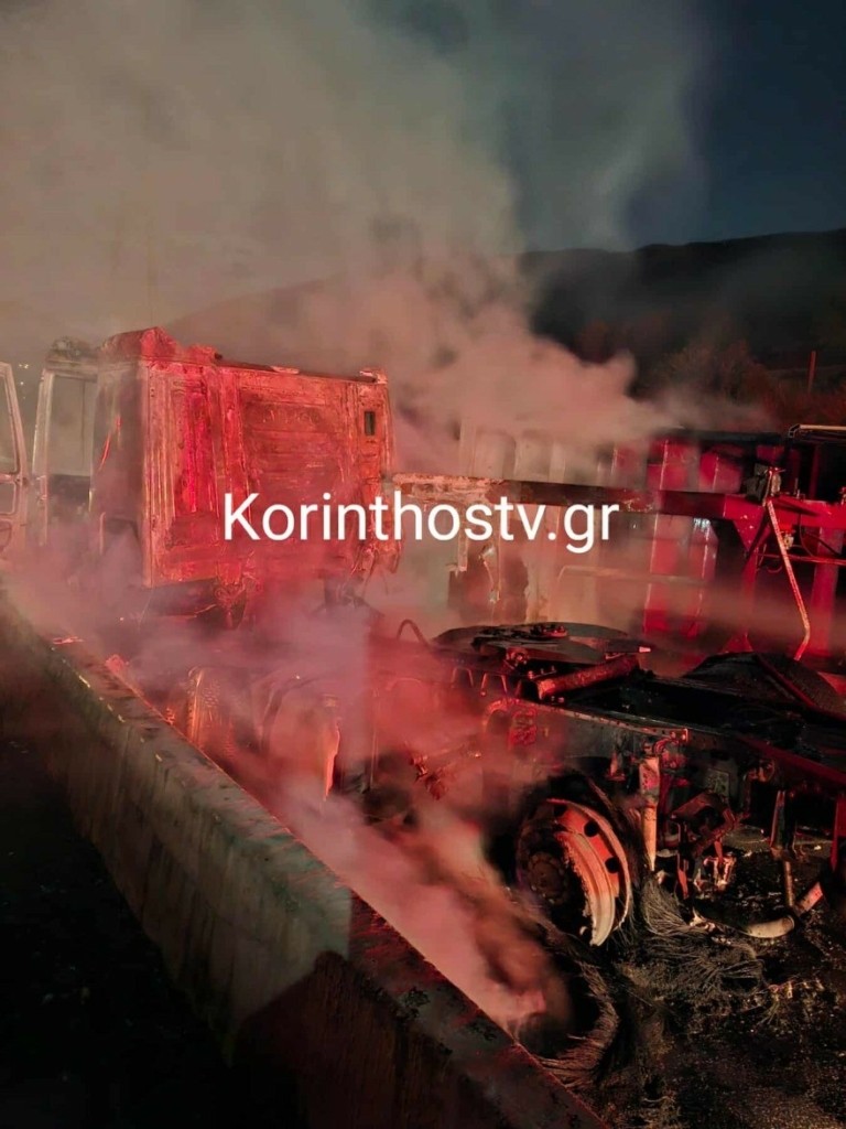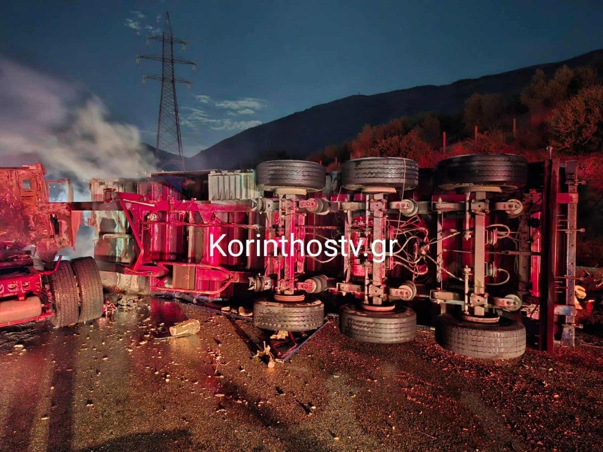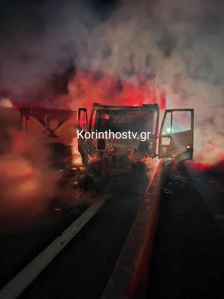 Από τη σφοδρή σύγκρουση, η νταλίκα τυλίχθηκε στις φλόγες, σύμφωνα με το korinthostv.gr.