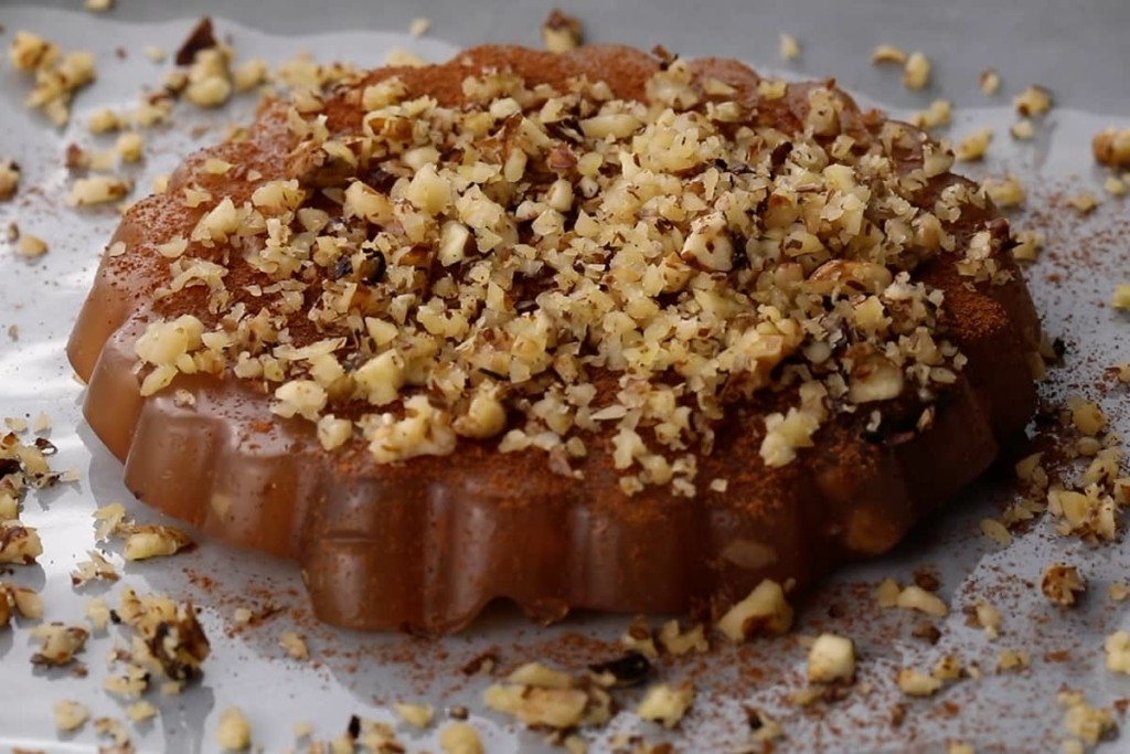 3.Μόλις το μίγμα είναι έτοιμο και σχηματίζει ζάρες στην επιφάνεια, ρίξτε τα καρύδια ή τα αμύγδαλα, αν χρησιμοποιήσετε, και μεταφέρετέ το σε 4 μπολάκια ή σε φόρμα καλούπι που έχετε βρέξει με λίγο νερό.