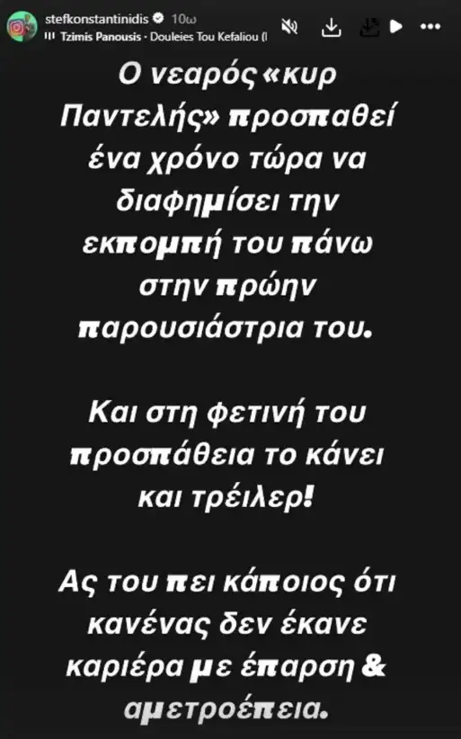 Γνωστό παρουσιαστή για τη συμπεριφορά του «καρφώνει» ο Στέφανος Κωνσταντινίδης σε νέα ανάρτησή του στα social media, υποστηρίζοντας ότι ο εν λόγω κύριος επιδιώκει εδώ και έναν χρόνο να διαφημίσει την εκπομπή του «πάνω σε πρώην παρουσιάστριά του».