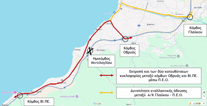 Η Ολυμπία Οδός ενημερώνει τους οδηγούς ότι, στο πλαίσιο των εργασιών για την ολοκλήρωση του υπολειπόμενου τμήματος Μιντιλόγλι- Αλισσός του νέου αυτοκινητόδρομου Πατρών- Πύργου, από τη Δευτέρα 15/9/2025 ώρα 14:00 έως την Κυριακή 30/11/2025 θα τεθεί σε εφαρμογή προσωρινή εκτροπή της κυκλοφορίας και των δύο κατευθύνσεων μεταξύ του Ανισόπεδου Κόμβου (Α/Κ) Οβρυάς και του Α/Κ ΒΙ.ΠΕ προς την Π.Ε.Ο. Πατρών-Πύργου.