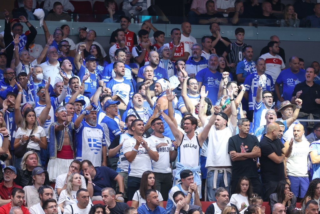 Έξω από το ξενοδοχείο της Ελλάδας συγκεντρώθηκαν δεκάδες Έλληνες για να αποθεώσουν τα παιδιά του Σπανούλη και να φώναξαν συνθήματα για πρόκριση στον τελικό της Κυριακής όπου περιμένει η Γερμανία.