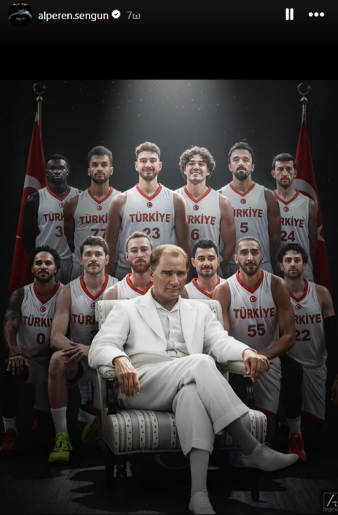 Ο μεγάλος αστέρας της Εθνικης Τουρκίας και άσος των Χιούστον Ρόκετς ανάρτησε AI φωτογραφία που δείχνει τον Κεμάλ σε μια καρέκλα και πίσω του όλους τους παίκτες της τουρκικής εθνικής ομάδας μπάσκετ.