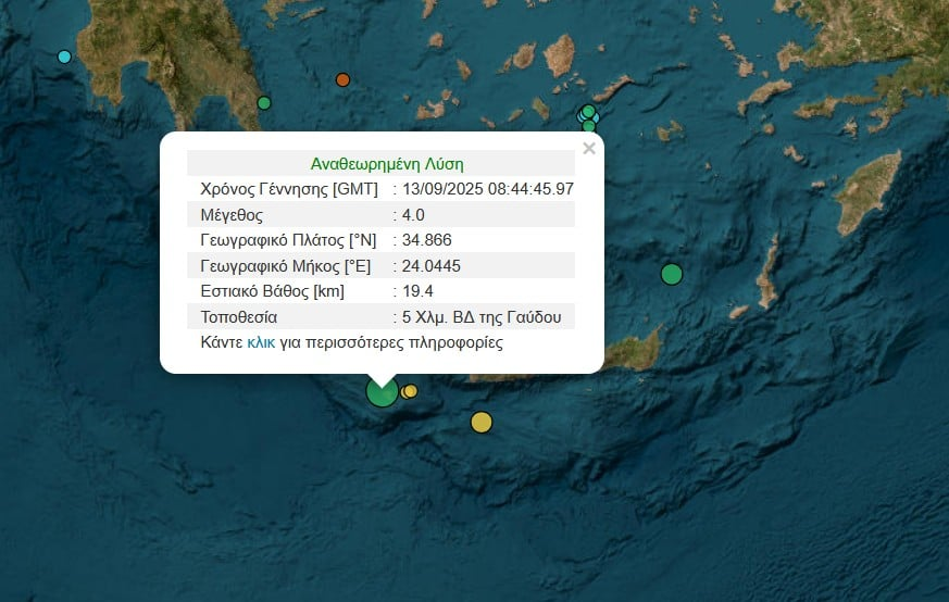Το επίκεντρο της δόνησης εντοπίζεται στο θαλάσσιο χώρο 5 χλμ. ΒΔ της Γαύδου.