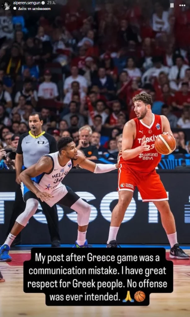 Τους τόνους θέλησε να ρίξει και ο Τούρκος σέντερ. Ο Σενγκούν ανέβασε ανάλογο story στο οποίο ζητάει συγνώμη από τους Έλληνες για την… προκλητική λεζάντα που χρησιμοποίησε μετά τον ημιτελικό, «Δεν θα ήταν ωραίος καιρός για θάλασσα;»