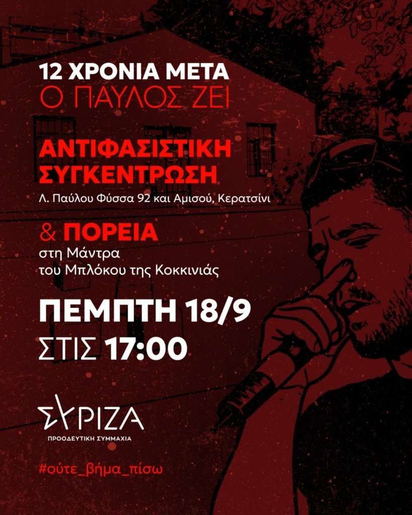 «Δώδεκα χρόνια μετά, η επέτειος της δολοφονίας του Παύλου Φύσσα συμπίπτει με τη θλιβερή απόφαση για αποφυλάκιση του αρχηγού της νεοναζιστικής συμμορίας, Νίκου Μιχαλολιάκου, που αποτελεί πρόκληση για κάθε δημοκράτη πολίτη. Την ίδια στιγμή, η ακροδεξιά, φανερά ή συγκεκαλυμμένα, σηκώνει επικίνδυνα ξανά κεφάλι στην Ευρώπη και τον κόσμο. Στην Ελλάδα, η φασιστική απειλή είναι εδώ και οι ρατσιστικές κραυγές, ακόμα κι από υψηλόβαθμα στελέχη της κυβέρνησης Μητσοτάκη, πληθαίνουν και δηλητηριάζουν το κοινωνικό σώμα», αναφέρει ο ΣΥΡΙΖΑ στο δικό του κάλεσμα.
