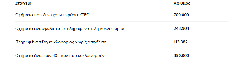 Εφιαλτικά είναι τα στοιχεία για την κατάσταση με τα οχήματα που κυκλοφορούν στους ελληνικούς δρόμους: χιλιάδες οχήματα που δεν έχουν περάσει ΚΤΕΟ, δεν διαθέτουν ασφάλεια ή κυκλοφορούν χωρίς να έχουν πληρώσει τέλη, αλλά και ένας αριθμός 350.000 αυτοκινήτων, που εμφανίζονται να είναι πάνω από 40 ετών, συνεχίζουν να κινούνται, δημιουργώντας σοβαρούς κινδύνους.