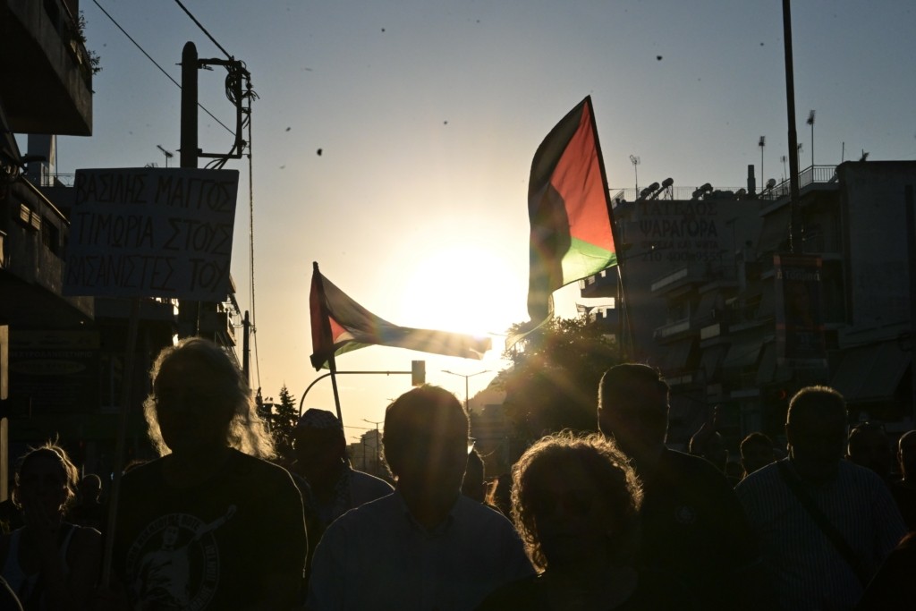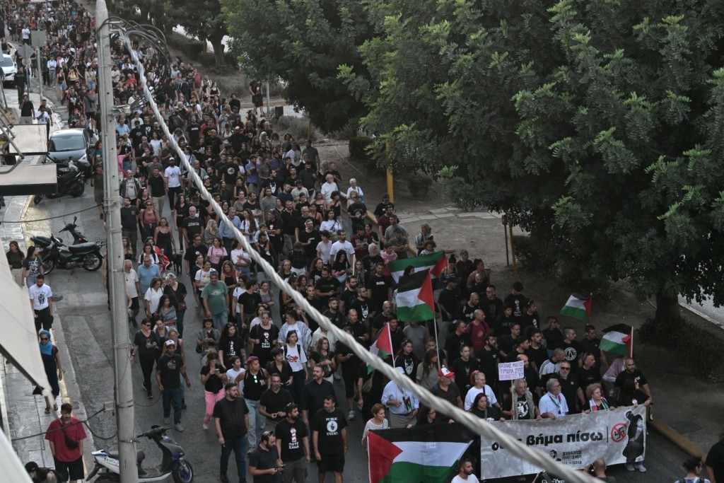 Στην κεφαλή της πορείας η Μάγδα Φύσσα με το πανό να αναγράφει «Ούτε βήμα πίσω», ενώ δίπλα ο κόσμος κρατά μια μεγάλη παλαιστινιακή σημαία σε ένδειξη αλληλεγγύης στον παλαιστινιακό λαό.