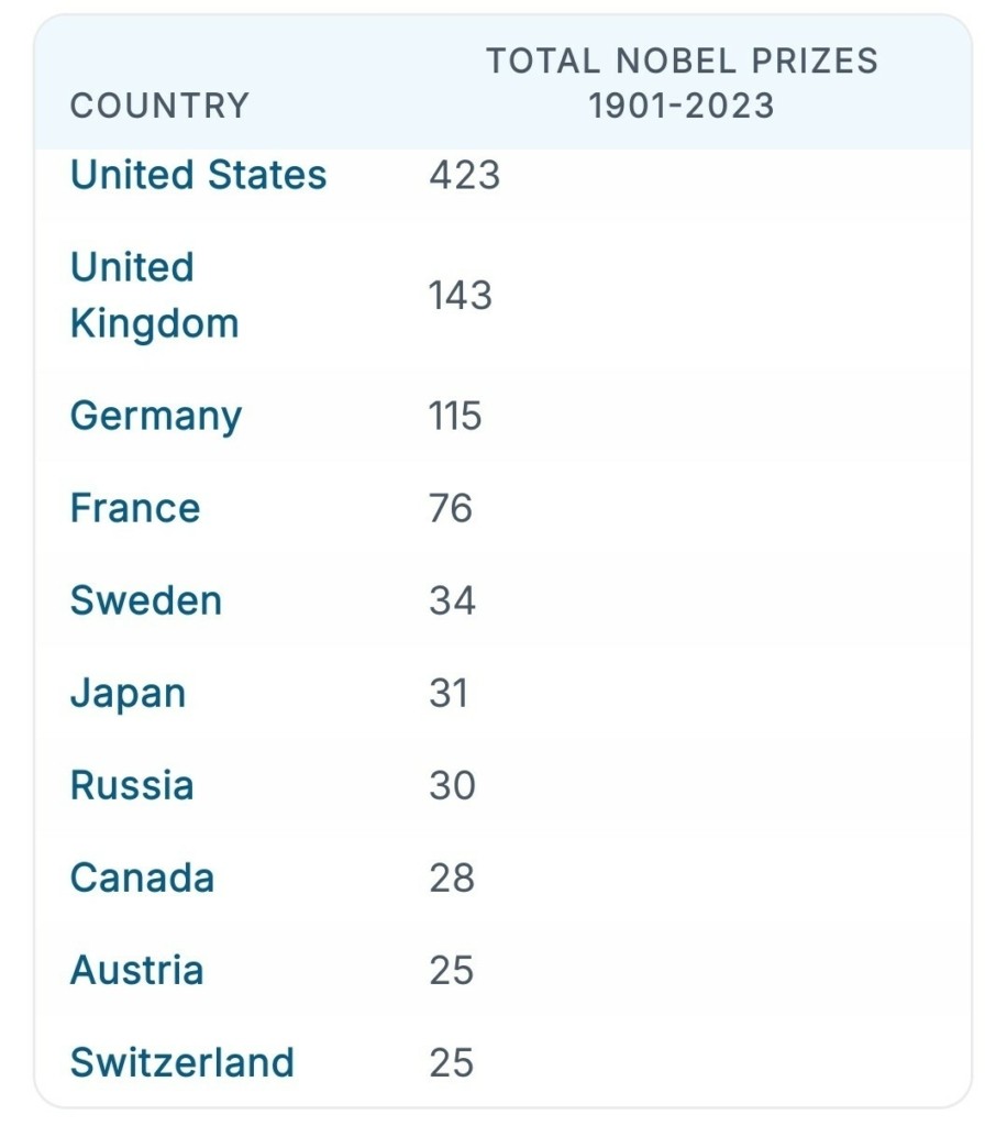 Από αυτά, τα 6 είναι βραβεία Νόμπελ Χημείας, τα 3 είναι Νόμπελ Ειρήνης, τα 3 στην Οικονομία και το ένα στη Λογοτεχνία. Είναι λίγα; Προφανώς όχι. Αλλά σίγουρα δεν είναι τα περισσότερα.