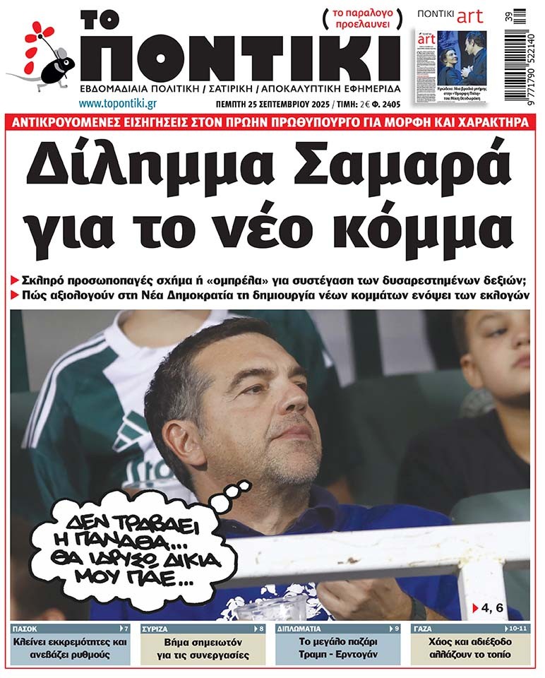 Με πρωτοσέλιδο τίτλο «Δίλημμα Σαμαρά για το νέο κόμμα» και αναλυτικό – αποκαλυπτικό ρεπορτάζ για τις αντικρουόμενες εισηγήσεις στον πρώην πρωθυπουργό για μορφή και χαρακτήρα, αν θα έχει δηλαδή «σκληρό προσωπαγές σχήμα ή θα είναι «ομπρέλα» για συστέγαση των δυσαρεστημένων δεξιών, αλλά και για το πώς αξιολογούν στη Νέα Δημοκρατία τη δημιουργία νέων κομμάτων ενόψει των εκλογών, κυκλοφορεί το «ΠΟΝΤΙΚΙ» το πρωί της Πέμπτης.