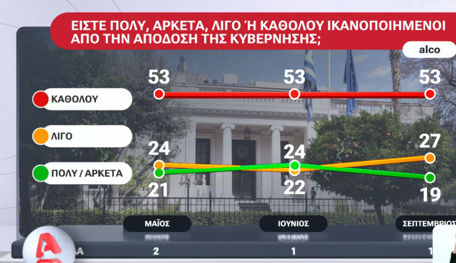 Πάνω από τους μισούς, το 53%, δηλώνουν καθόλου ικανοποιημένοι από την απόδοση της κυβέρνησης. Το 27% απαντά λίγο και το 19% λέει ότι είναι πολύ- αρκετά ικανοποιημένο.