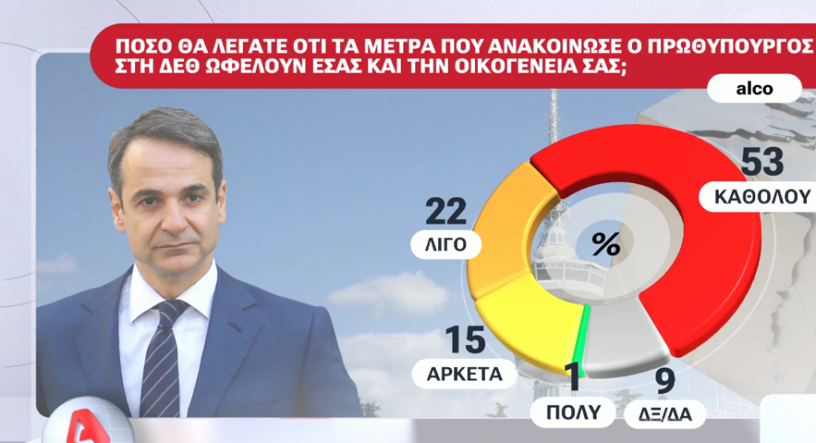 Ερωτηθέντες για το εάν πιστεύουν ότι θα τους ωφελήσουν τα μέτρα που εξήγγειλε ο Κυριάκος Μητσοτάκης στη ΔΕΘ, το 53% απαντούν καθόλου, το 22% λίγο, το 15% αρκετά και μόλις το 1% πολύ.