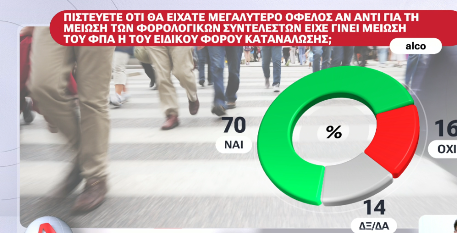 Επιπλέον, το 70% πιστεύει ότι θα είχε μεγαλύτερο όφελος αν αντί για μείωση φορολογικών συντελεστών είχε γίνει μείωση ΦΠΑ ή ειδικού φόρου κατανάλωσης.