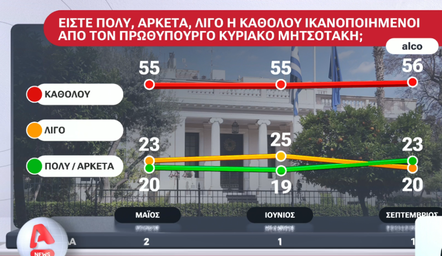 Καθόλου ικανοποιημένο από τον Κυριάκο Μητσοτάκη δηλώνει το 56%, «Λίγο» απαντά το 23% στο ίδιο ερώτημα και πολύ- αρκετά το 20%.