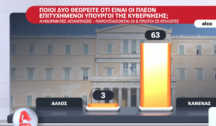 Ιδιαίτερο ενδιαφέρον έχει η άποψη των πολιτών και για τους υπουργούς. Το 63% απαντούν «κανένας» στην ερώτηση για τους πιο επιτυχημένους υπουργούς, ποσοστό κατά 11 μονάδες υψηλότερο από τον Ιούνιο.