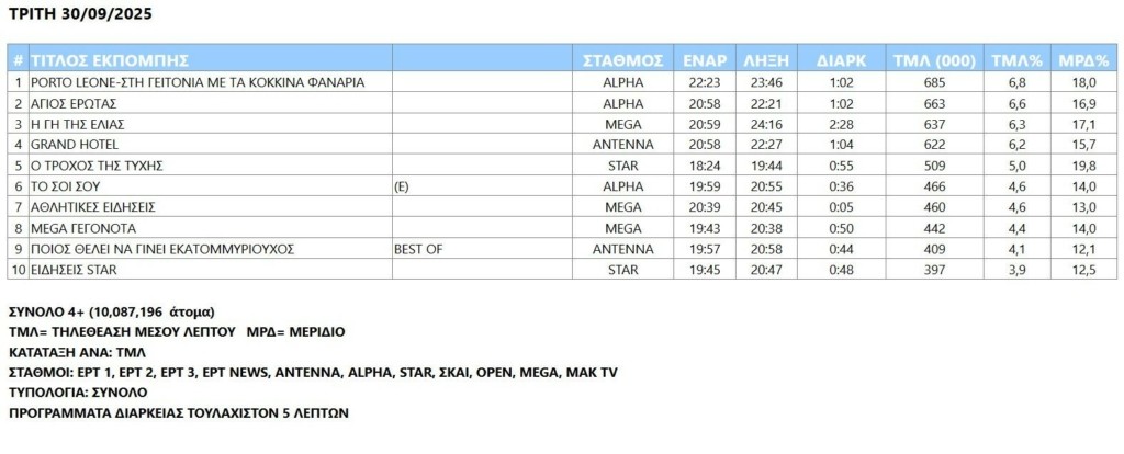 Ανακατατάξεις σημειώθηκαν και στις επόμενες θέση του ημερήσιο τηλεβαρόμετρου της Nielsen καθώς η «Γη της ελιάς» αναδείχθηκε τρίτο σε προτιμήσεις πρόγραμμα της ημέρας με αποτέλεσμα το «Grand Hotel» να πλασαριστεί εκεί που ήταν προχθές η σειρά του Mega.