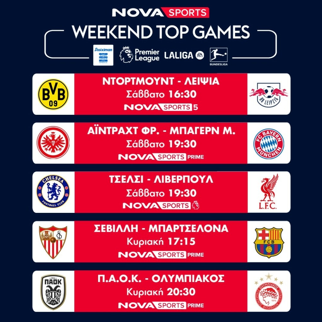 Πανδαισία με πλούσιο ποδοσφαιρικό θέαμα από τα γήπεδα της Ελλάδας και της Ευρώπης, περιμένει τους συνδρομητές της Nova και αυτή την εβδομάδα μέσα από το ασυναγώνιστο μπουκέτο αθλητικού περιεχομένου που περιλαμβάνει όλα τα αθλητικά γεγονότα των καναλιών Novasports και Cosmote Sport, όλα στην πλατφόρμα EON!