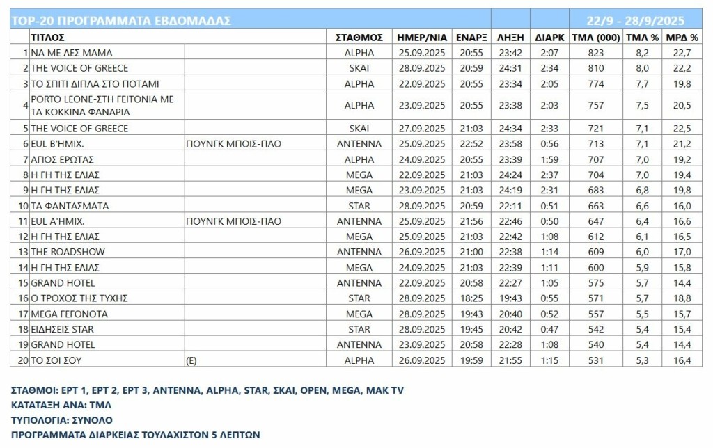 Έχει ενδιαφέρον το στοιχείο ότι στις πέντε πρώτες θέσεις οι τρεις καταλήφθηκαν από επεισόδια σειρών του Alpha και οι άλλες δύο από τα εναρκτήρια επεισόδια του μουσικού σόου του ΣΚΑΪ.