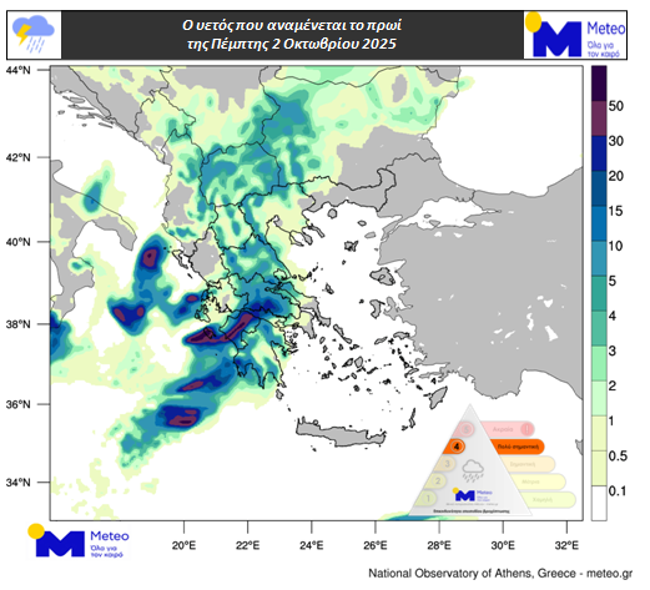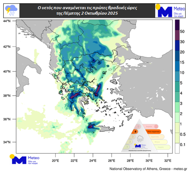 Σε εξέλιξη βρίσκεται η 48ώρη κακοκαιρία με βροχές και καταιγίδες να πλήττούν το βράδυ το Ιόνιο, ενώ από τις πρώτες ώρες της Πέμπτης 02/10 τα φαινόμενα θα επεκταθούν και στα ηπειρωτικά, με εξαίρεση την Ανατολική Μακεδονία και Θράκη. Η Ανατολική Μακεδονία και Θράκη, το Βόρειο Αιγαίο, οι Κυκλάδες και η Κρήτη αναμένεται να επηρεαστούν από το μεσημέρι. Τα φαινόμενα θα είναι κατά τόπους ισχυρά στο Ιόνιο και στα δυτικά ηπειρωτικά έως το απόγευμα της, στην Πελοπόννησο από τις πρώτες ώρες έως και τις βραδινές ώρες της Πέμπτης 02/10 και στην Ανατολική Στερεά, σε τμήματα της Κεντρικής και Ανατολικής Μακεδονίας, στο Βόρειο Αιγαίο και στην Κρήτη από το απόγευμα της Πέμπτης 02/10.