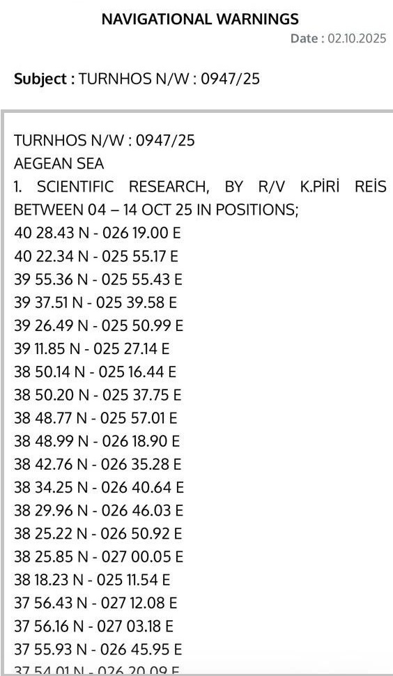 Η νέα NAVTEX από τον υδρογραφικό σταθμό της Σμύρνης, που εκδόθηκε σήμερα Πέμπτη 2 Οκτωβρίου 2025, είναι σχεδόν ίδια με την προηγούμενη και προβλέπει την έξοδο του ερευνητικού πλοίου σε μια περιοχή δυτικά της Χίου και της Μυτιλήνης, από 4 ως 14 Οκτωβρίου.