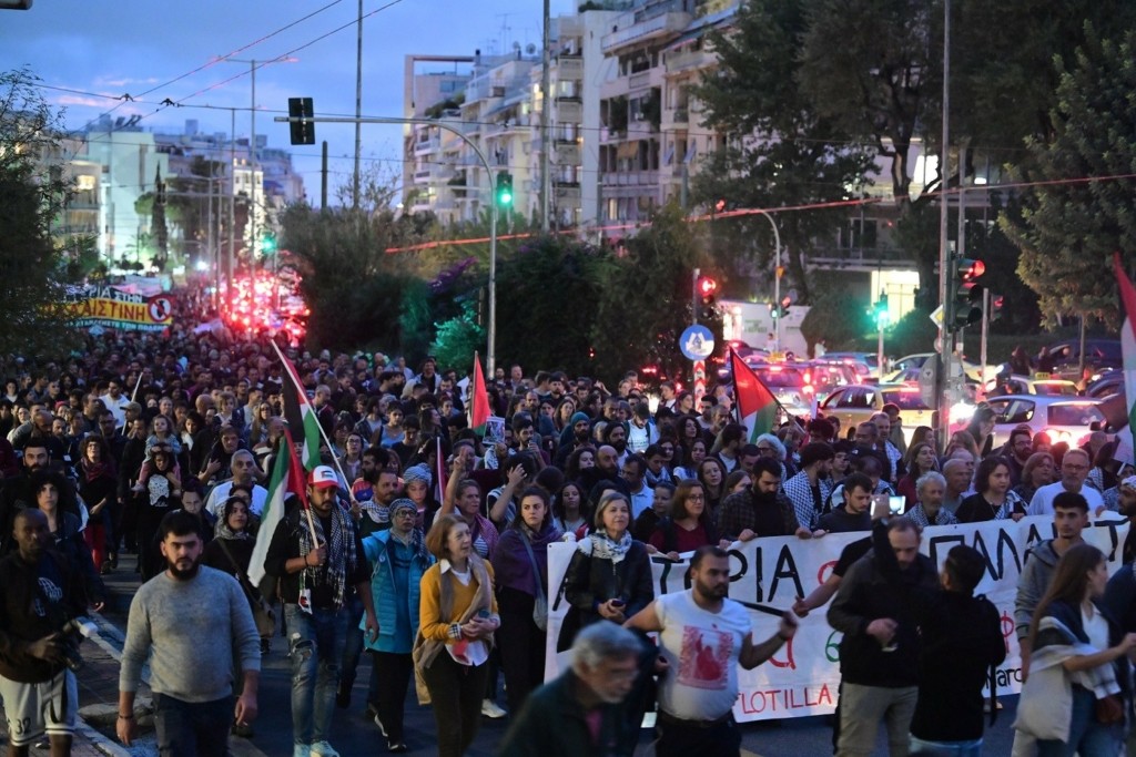 Το απόγευμα της Πέμπτης (2/10) στην Αθήνα πραγματοποιήθηκε δυναμική και μαζική πορεία από το Μέγαρο Μουσικής μέχρι την πρεσβεία του Ισραήλ.