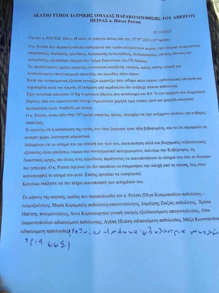«Για τον κ. Ρούτσι Πάνο, 48 ετών, σε απεργία πείνας από την 15η 9ου 2025