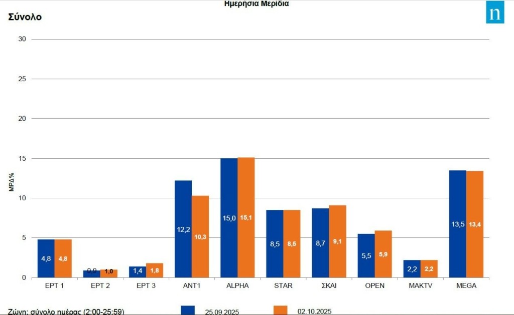Διατηρήθηκαν στις προχθεσινές θέσεις κατάταξης ΣΚΑΪ και Star εμφανίζοντας τάσεις ανοδικές στις δυναμικές τους , όπως επίσης και το Open. Η ΕΡΤ1 συντηρήθηκε κάτω του 5%.