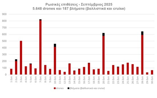 Συνολικά, τον Σεπτέμβριο του 2025, οι ρωσικές δυνάμεις εκτόξευσαν 5.648 drones και 187 πυραύλους.