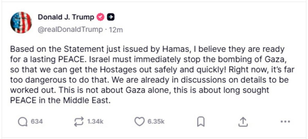 Με ανάρτησή του στο δίκτυό του Truth Social, ο Τραμπ ανέφερε λίγο μετά τα μεσάνυχτα της ότι το Ισραήλ πρέπει να «σταματήσει αμέσως τους βομβαρδισμούς στη Λωρίδα της Γάζας», λέγοντας ότι η «Χαμάς είναι έτοιμη για διαρκή ειρήνη».