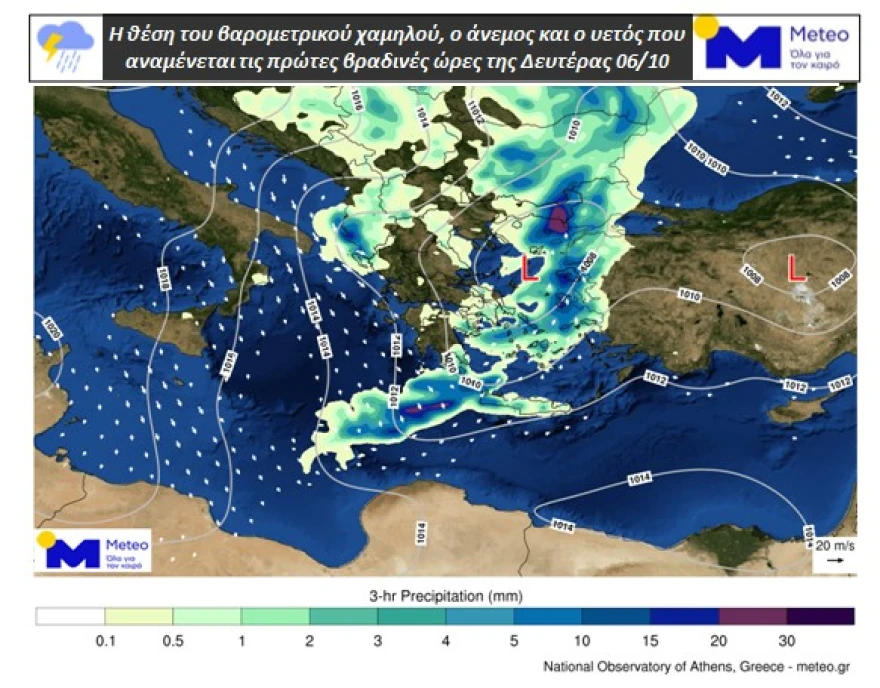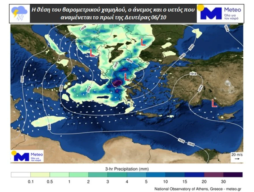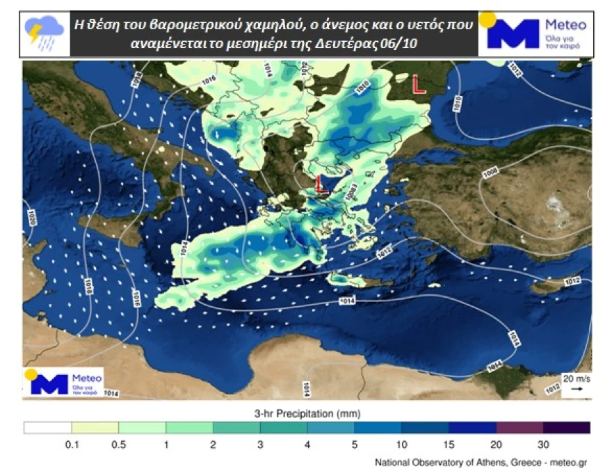 Στους σχετικούς χάρτες παρουσιάζεται η θέση του βαρομετρικού χαμηλού, ο άνεμος κοντά στο έδαφος και ο υετός που αναμένεται το πρωί, το μεσημέρι και τις πρώτες βραδινές ώρες της Δευτέρας (6/10).