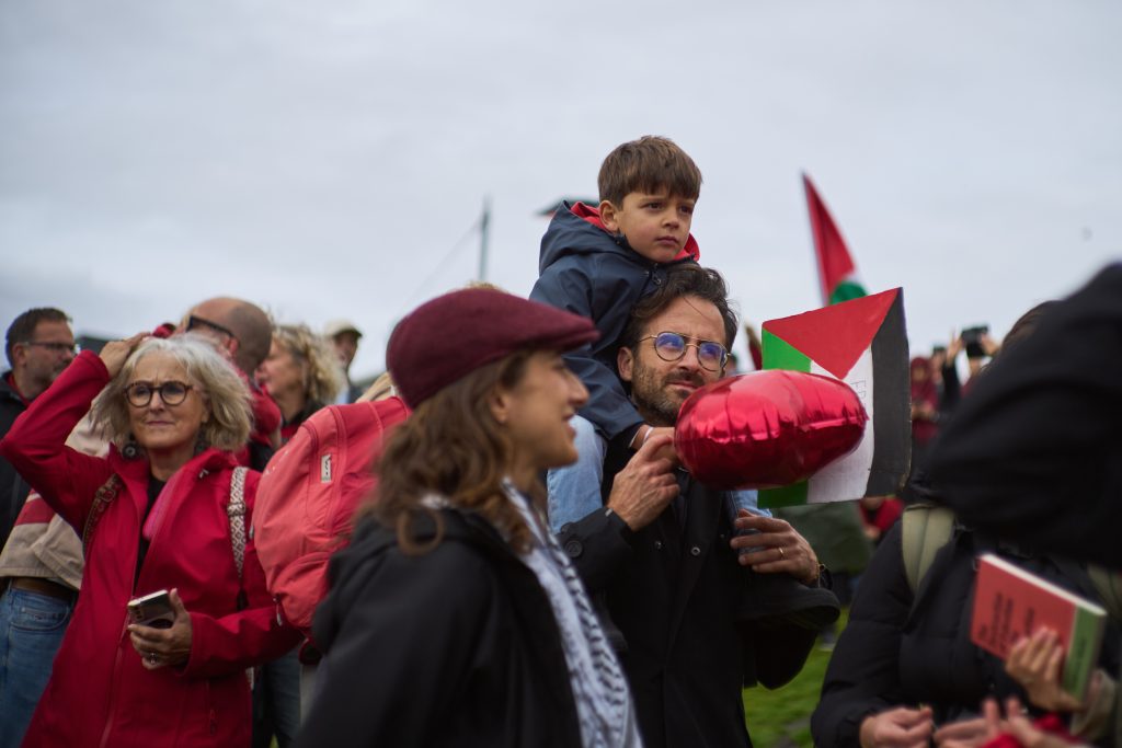 Πίσω από ένα τεράστιο, κόκκινο πανό με το σύνθημα «Να σταματήσουμε τη γενοκτονία στην Παλαιστίνη – Στοπ στο εμπόριο όπλων με το Ισραήλ», περίπου 70.000 άνθρωποι, σύμφωνα με τη δημοτική αστυνομία, διαδήλωσαν ειρηνικά στο κέντρο της πόλης. Το πλήθος φώναζε συνθήματα όπως «Μποϊκοτάζ στο Ισραήλ» και «Ελεύθερη Παλαιστίνη».
