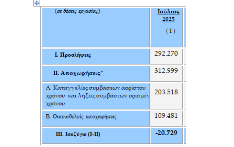 Πιο συγκεκριμένα, από την Έκθεση «Ροές Μισθωτής Απασχόλησης στον Ιδιωτικό Τομέα» του Π/Σ «ΕΡΓΑΝΗ» για τον Ιούλιο 2025 που δημοσιεύθηκαν πρόσφατα, συνάγονται τα εξής ευρήματα: