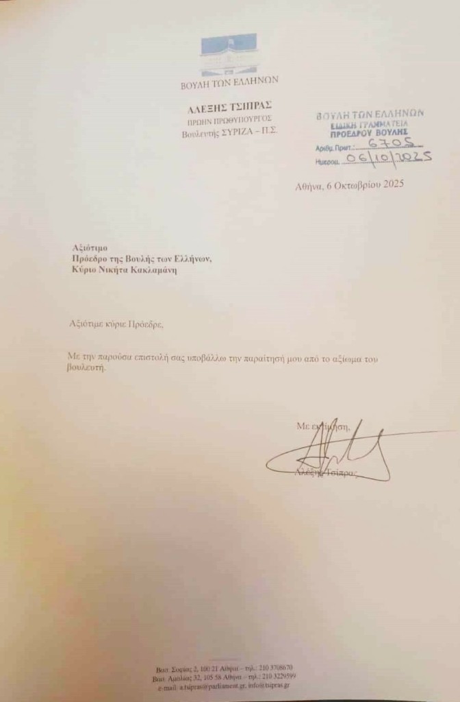 Την παραίτησή του από το βουλευτικό αξίωμα ανακοίνωσε ο Αλέξης Τσίπρας, τονίζοντας, μεταξύ άλλων, ότι πρόκειται για απόφαση «συνείδησης», με στόχο την επιστροφή του «στην κοινωνική δράση», μακριά από αξιώματα και κομματικούς μηχανισμούς.