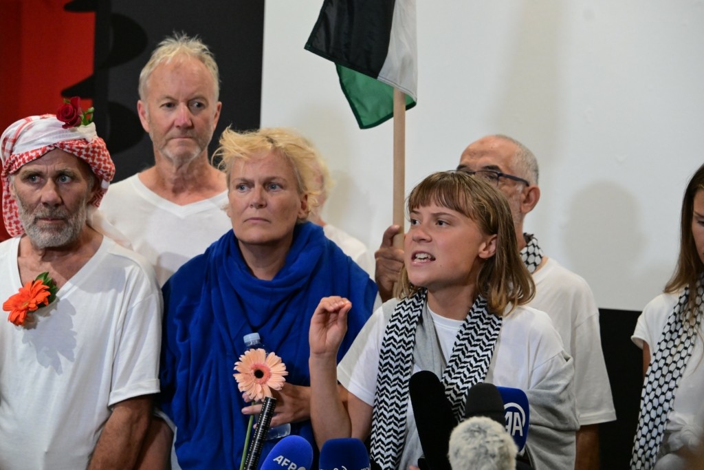 Στις δηλώσεις της στους δημοσιογράφους η Τούνμπεργκ είπε πως «στη Γάζα πραγματοποιείται μια γενοκτονία και μάλιστα μπροστά στα μάτια μας» και συνέχισε λέγοντας «Δεν θα καταλάβω ποτέ πώς οι άνθρωποι μπορούν να είναι τόσο κακοί. Ότι θα λιμοκτονούσαν σκόπιμα εκατομμύρια ανθρώπους που ζουν παγιδευμένοι υπό παράνομη πολιορκία ως συνέχεια δεκαετιών καταπίεσης και απαρτχάιντ».