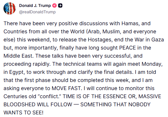 «Έγιναν πολύ θετικές συνομιλίες το σαββατοκύριακο με τη Χαμάς και χώρες από όλο τον κόσμο (αραβικές, μουσουλμανικές κι όλες τις υπόλοιπες) για να απελευθερωθούν οι όμηροι, να τελειώσει ο πόλεμος στη Γάζα και, πάνω απ’ όλα, να υπάρξει η πολυπόθητη ειρήνη στη Μέση Ανατολή», ανέφερε ο ρεπουμπλικάνος μέσω Truth Social. Πρόσθεσε αναφερόμενος στις έμμεσες διαπραγματεύσεις που ξεκινούν σήμερα πως «μου λένε ότι η πρώτη φάση αναμένεται να ολοκληρωθεί αυτή την εβδομάδα, και ζητώ από όλους να κινηθούν γρήγορα», πληκτρολογώντας αυτές τις δύο τελευταίες λέξεις, όπως και τη λέξη «ειρήνη», με κεφαλαία γράμματα, όπως συνηθίζει.