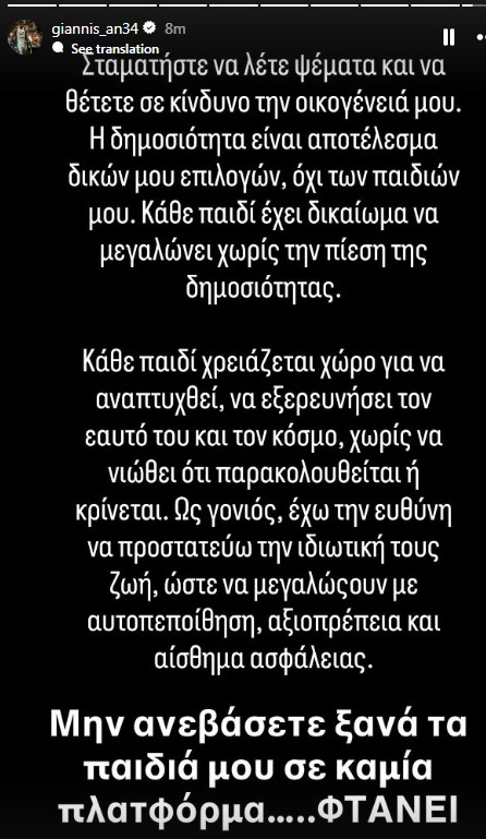 Ο ηγέτης των Μπακς και της Εθνικής Ελλάδας τόνισε ότι η δημοσιότητα είναι αποτέλεσμα των δικών του επιλογών και θέλει τα παιδιά του να μεγαλώσουν με αυτοπεποίθηση, αξιοπρέπεια και αίσθημα ασφάλειας.