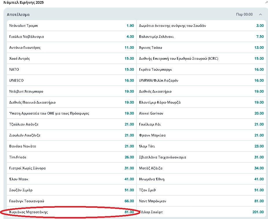 Στη λίστα με 41 απόδοση για Νόμπελ Ειρήνης βρίσκεται και ο… Ελον Μασκ (!), ενώ αν κοιτάξει χαμηλά, με απόδοση 81, υπάρχει και το όνομα του Κυριάκου Μητσοτάκη. Συγκεκριμένα στην προτελευταία θέση όπου ξεπερνά την… Τέιλορ Σουίφτ (201).