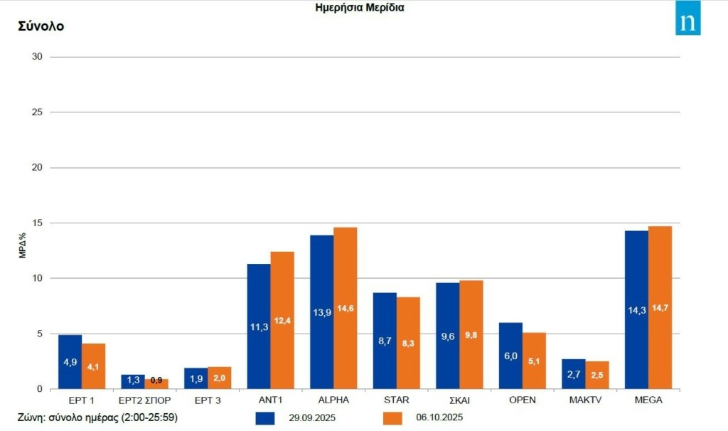 Το Open είδε το μερίδιο του να διαμορφώνεται λίγο πάνω από το 5% και η ΕΡΤ1 ξαναπέρασε στην περιοχή του 4%.