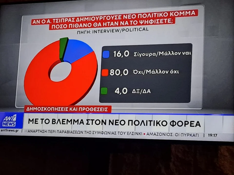 Στο ερώτημα αν θα ψήφιζαν ένα νέο κόμμα του Αλέξη Τσίπρα, οι 8 στους 10 λένε «όχι ή μάλλον όχι», ενώ ένα υπολογίσιμο 16% λέει «σίγουρα ναι ή μάλλον ναι».