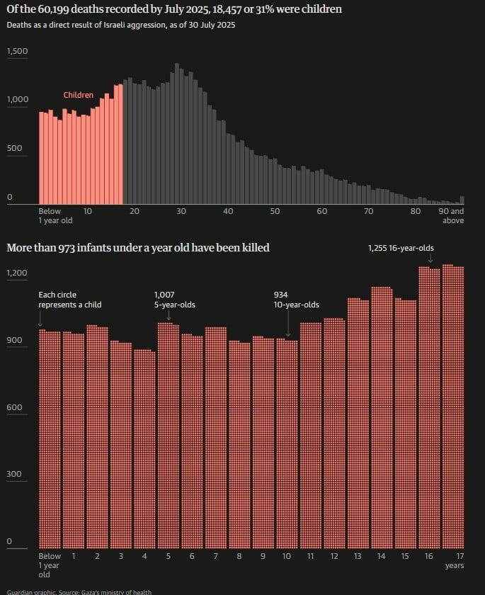 Μέχρι τα τέλη Ιουλίου, 18.457 παιδιά αναφέρονταν στην εκτενή επίσημη λίστα Παλαιστίνιων θυμάτων του πολέμου του Ισραήλ στη Γάζα. Σε διάστημα σχεδόν δύο ετών, αυτό ισοδυναμεί με το να σκοτώνεται ένα αγόρι ή ένα κορίτσι κάθε ώρα, κάθε μέρα, από βόμβες, σφαίρες ή οβίδες, σύμφωνα με τον Guardian.