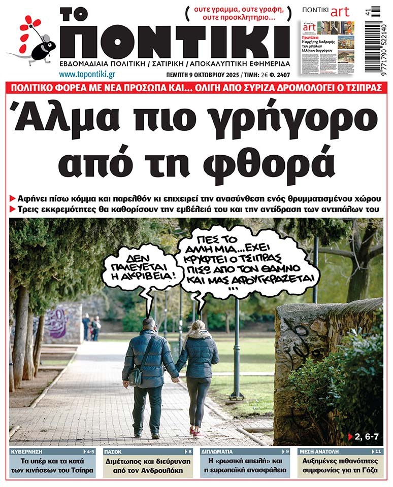 Με πρωτοσέλιδο τίτλο «Άλμα πιο γρήγορο από τη φθορά» και αναλυτικό – αποκαλυπτικό ρεπορτάζ για τον πολιτικό φορέα που δρομολογεί ο Τσίπρας, που αφήνει πίσω κόμμα και παρελθόν και επιχειρεί την ανασύνθεση ενός θρυμματισμένου χώρου, αλλά και για τις τρεις εκκρεμότητες που θα καθορίσουν την εμβέλειά του και την αντίδραση των αντιπάλων του, κυκλοφορεί το «ΠΟΝΤΙΚΙ» το πρωί της Πέμπτης.