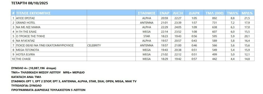 Συνέχισε πρώτος ο Alpha σε τηλεθέαση και την Τετάρτη (8/10)